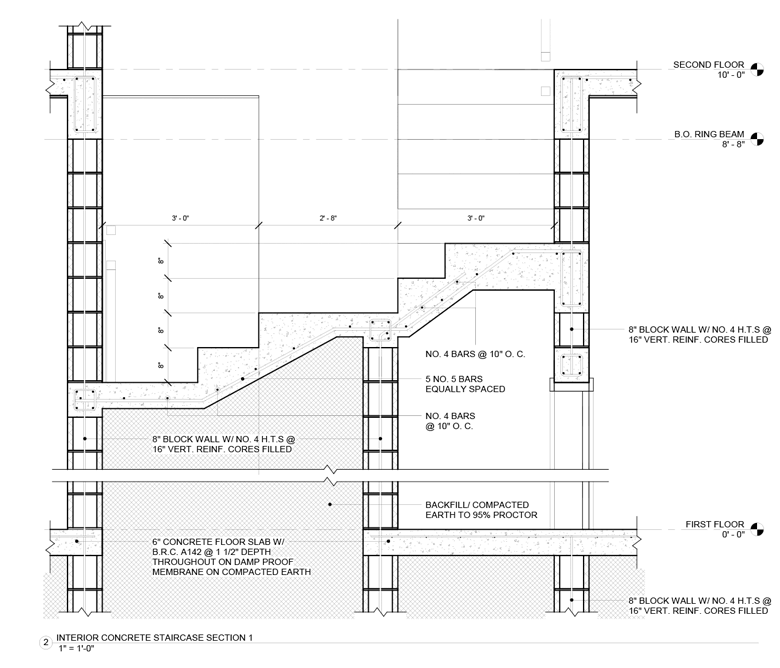 As with the roof, a detailed staircase section makes the builder’s job a lot easier. He can see in full detail exactly how each piece of steel interacts with another within the poured staircase slab.