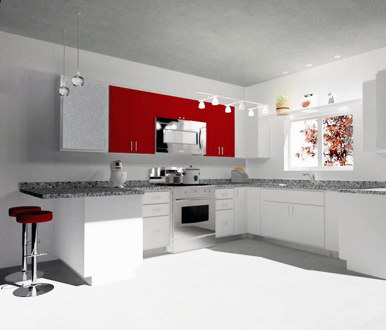 Color balance makes a huge difference in how a space is received by the onlooker. To break up the monotony of a sterile all-white kitchen, I used a bold red as an accent color to draw attention to this quaint space without overwhelming it.